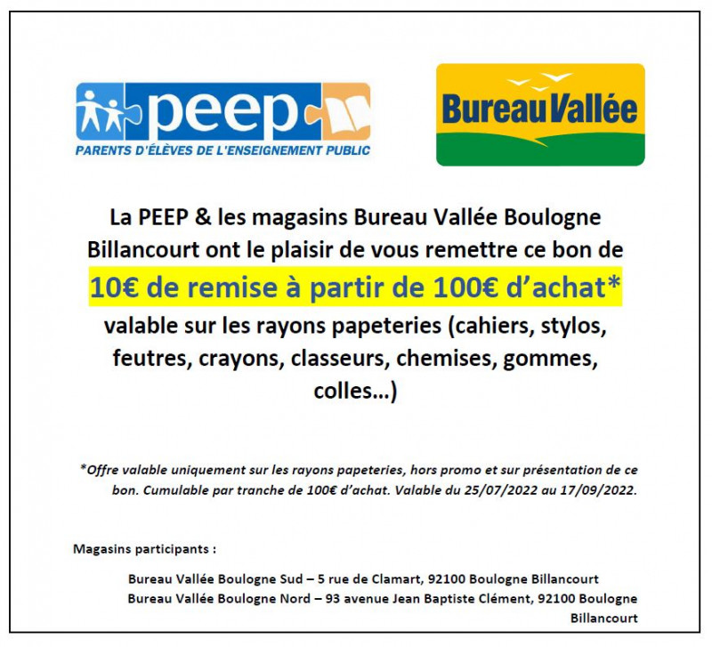 La PEEP Boulogne-Billancourt est heureuse de vous présenter l'offre de son partenaire local Bureau Vallée :